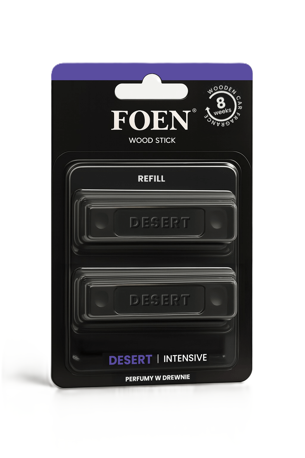 Zestaw dwóch wkładów zapachowych Foen Wood Stick Desert to idealne rozwiązanie dla osób, które pokochały nasz bestsellerowy zapach Desert – intensywny, wyrazisty i pełen orientalnych nut. Każdy refill wystarcza nawet na 8 tygodni użytkowania, co oznacza aż do 16 tygodni świeżego zapachu w Twoim samochodzie.
