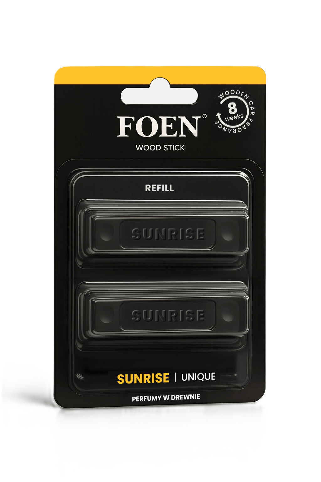 Zestaw dwóch refillów Foen Wood Stick Sunrise to doskonałe rozwiązanie dla tych, którzy szukają lekkiego, eleganckiego i trwałego zapachu do auta. Każdy wkład zapewnia aż do 8 tygodni zapachu – czyli nawet 16 tygodni przyjemnej świeżości w Twoim pojeździe.